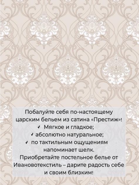Семейное постельное белье из сатина «Престиж» плотностью ткани 115 г/м2 - идеальное решение для создания уюта и комфортного сна. В комплекте: 2 пододеяльника 150 * 215 см, оснащенных удобной потайной застежкой на молнии, простыня 240 * 220 см, наволочки 70 * 70 см на молнии - 2 штуки, 50 * 70 см на молнии - 2 шт. Постельное белье из сатина «Престиж» нежное, мягкое, похожее на шёлк, но при этом прочное, износостойкое, выдерживает многочисленные стирки, не теряя исходного цвета. Семейный комплект постельного белья из сатина «Престиж» с роскошным дизайном и великолепным качеством ткани и пошива прослужит долго и будет радовать Вас и ваших близких. Размерность комплекта
