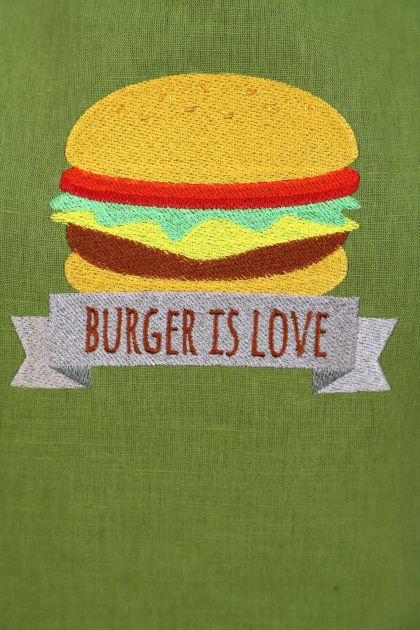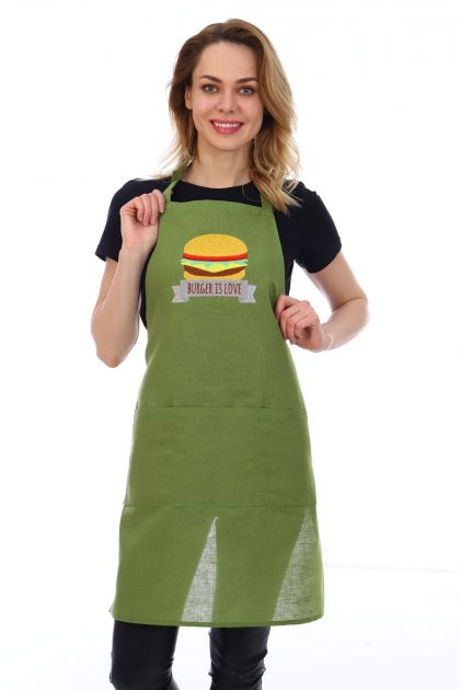 Фартук кухонный с вышивкой, лен (Бургер, зеленый)