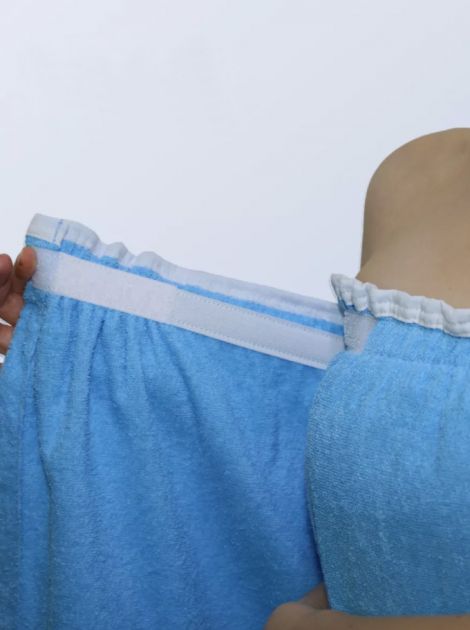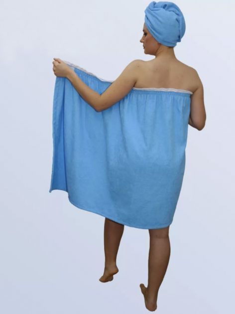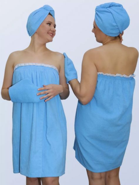 Комплект включает парео на резинке с липучкой, чалму и рукавичку.