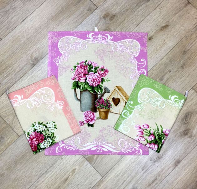 Прекрасные наборы кухонных полотенец размером 48*60 см. Яркие, стойкие расцветки. В комплекте три полотенца с петелькой. Состав ткани - хлопок 100 %. Ткань