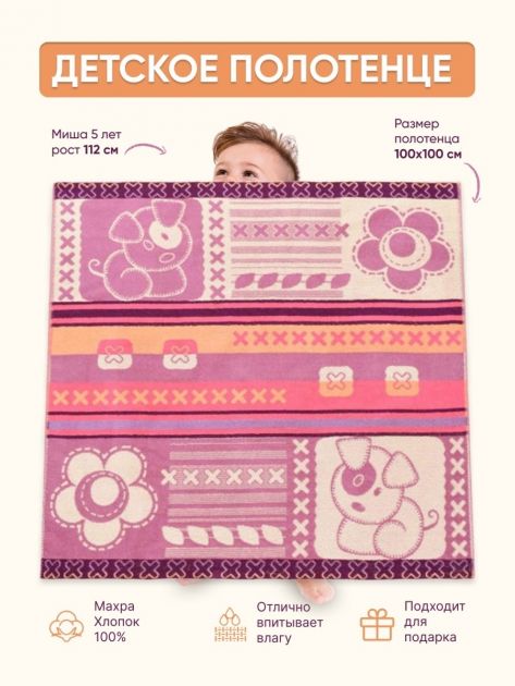 Махровое детское полотенце 100*100 см плотностью 420 г/м2. Состав ткани - 100 % хлопок. Очень устойчивые в стирке красители. Группа товара