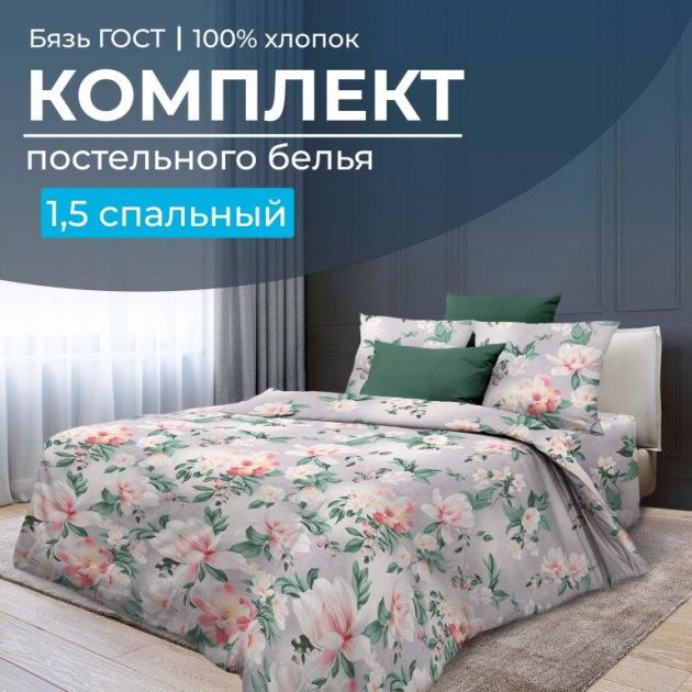 1,5-спальное постельное белье из бязи ГОСТ. Это очень плотная, лощёная ткань. Она имеет большой срок службы и проста в уходе. Качество рисунков, детализация и глубина тонов обеспечены современными техниками нанесения принтов на полотна.