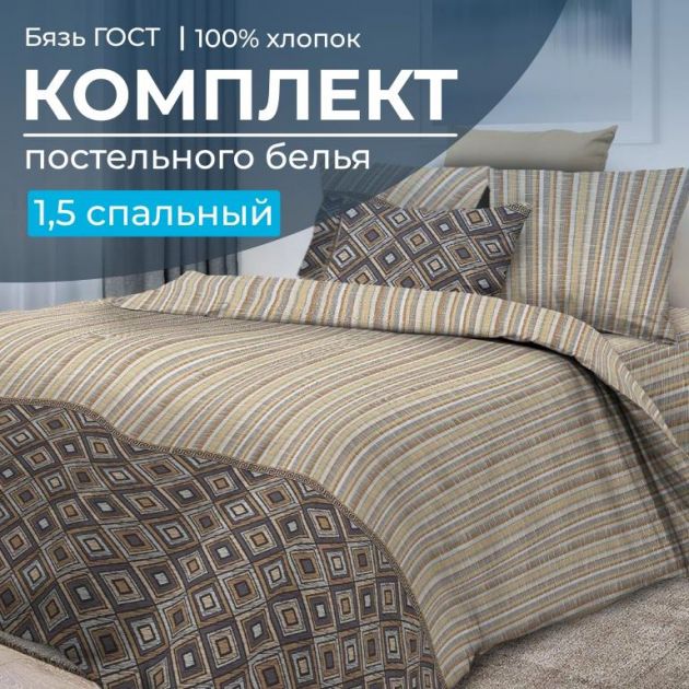 1,5-спальное постельное белье из бязи ГОСТ. Это очень плотная, лощёная ткань. Она имеет большой срок службы и проста в уходе. Качество рисунков, детализация и глубина тонов обеспечены современными техниками нанесения принтов на полотна.