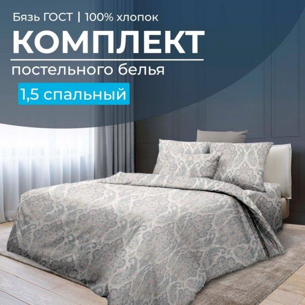 1,5-спальное постельное белье из бязи ГОСТ. Это очень плотная, лощёная ткань. Она имеет большой срок службы и проста в уходе. Качество рисунков, детализация и глубина тонов обеспечены современными техниками нанесения принтов на полотна.