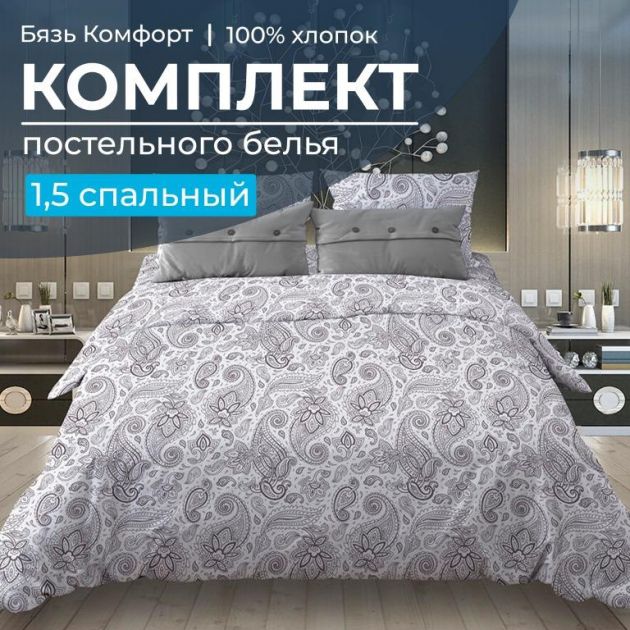 Практичный 1,5-спальный комплект хорошего качества из натурального хлопкового материала – набивной бязи.