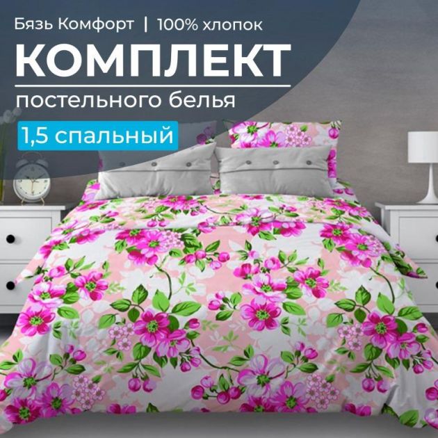 Комплект постельного белья 1,5-спальный, бязь "Комфорт" (Яблоневый цвет, розовый)