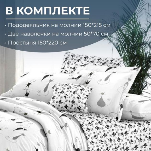 Комплект постельного белья 1,5-спальный, на молнии, поплин (Кошечка)