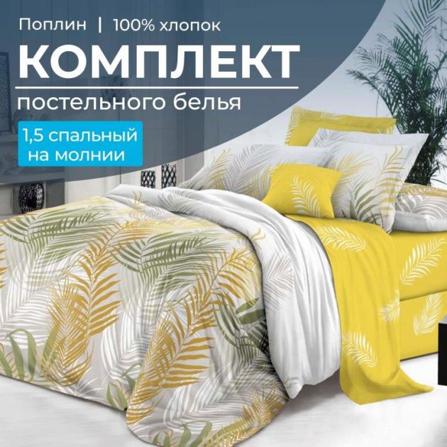 Комплект постельного белья 1,5-спальный, на молнии, поплин (Папоротник)