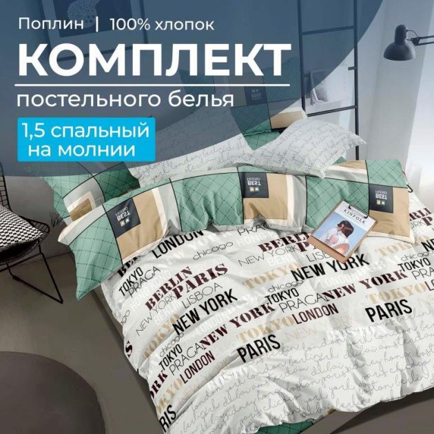 Комплект постельного белья 1,5-спальный, на молнии, поплин (Путешествие)