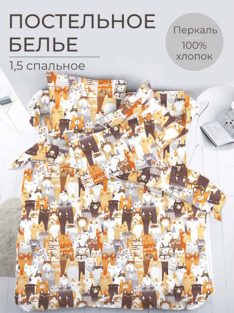 Комплект постельного белья 1,5-спальный, перкаль, детская расцветка (Котики)