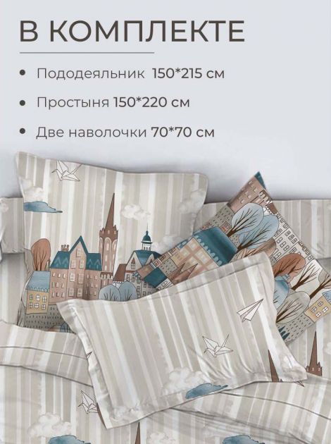 Размеры: пододеяльник 150 * 215 см (прорезь в нижнем шве), простыня 150 * 220 см, наволочка 70 * 70 см - 2 штуки.