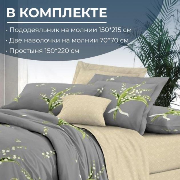 Размеры: пододеяльник 150*215 см, простыня 150*220 см, две наволочки 70*70 см Размерность комплекта