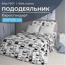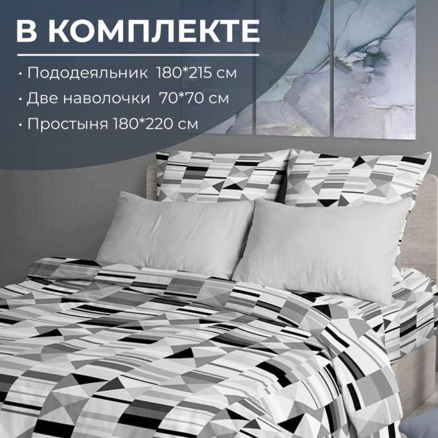 В комплекте: пододеяльник размером 180 * 215 см (прорезь в нижнем шве, длиной 70 см), простыня размером 180 * 220 см, две наволочки размером 70 * 70 см с глубоким клапаном не менее 25 см.
