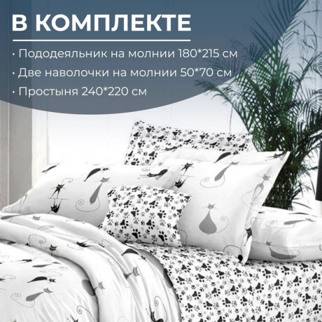 Комплект постельного белья 2-спальный с Евро простыней,на молнии, поплин (Кошечка)