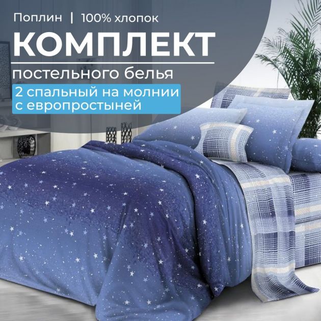 Комплект постельного белья 2-спальный с Евро простыней,на молнии, поплин (Ночное небо)