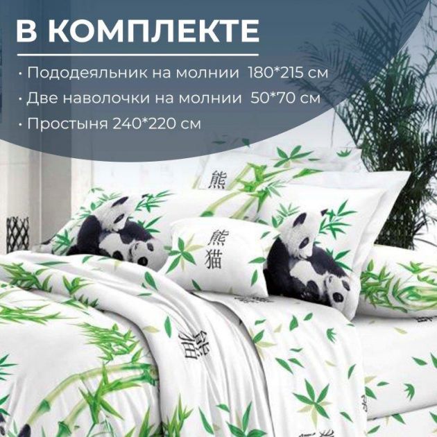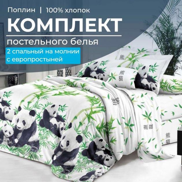 Комплект постельного белья 2-спальный с Евро простыней,на молнии, поплин (Панды)