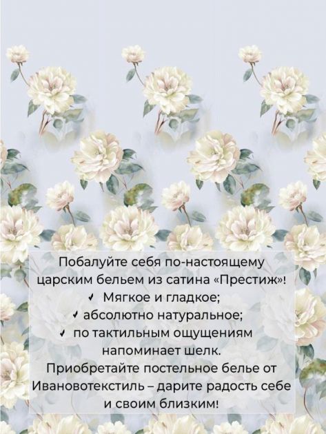 2 спальное постельное белье из сатина "Престиж" плотностью ткани 115 г/м2, несомненно станет достойным дополнением в вашей комнате так как имеет много достоинств: элегантный и благородный дизайн, высокое качество абсолютно натуральной ткани из 100% хлопка, отличное качество пошива, оно плотное, износостойкое, гипоаллергенное, очень приятное по тактильным ощущениям. В комплекте: пододеяльник 180*215 см, оснащенный удобной потайной застежкой на молнии, простыня 240*220 см, две наволочки 70*70 см на молнии. Комплекты постельного белья из сатина «Престиж» - это выбор людей, которые ценят комфорт и выбирают качество. Размерность комплекта