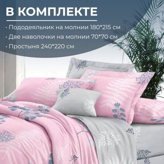 Размеры комплекта: пододеяльник 180*215 см, простыня 240*220 см, две наволочки 70*70 см