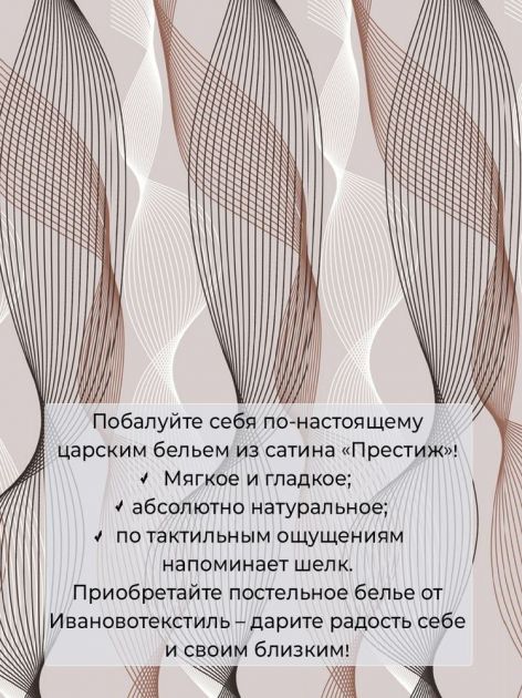 2 спальное постельное белье из сатина "Престиж" плотностью ткани 115 г/м2, несомненно станет достойным дополнением в вашей комнате так как имеет много достоинств: элегантный и благородный дизайн, высокое качество абсолютно натуральной ткани из 100% хлопка, отличное качество пошива, оно плотное, износостойкое, гипоаллергенное, очень приятное по тактильным ощущениям. В комплекте: пододеяльник 180*215 см, оснащенный удобной потайной застежкой на молнии, простыня 240*220 см, две наволочки 70*70 см на молнии. Комплекты постельного белья из сатина «Престиж» - это выбор людей, которые ценят комфорт и выбирают качество. Размерность комплекта