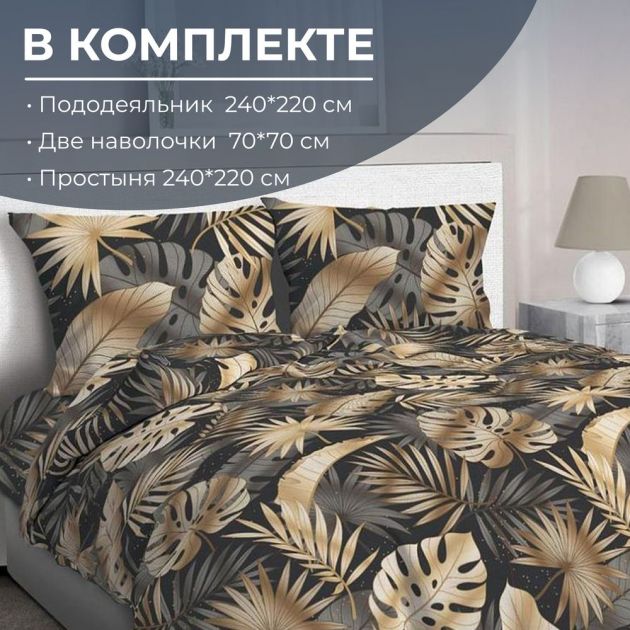 В комплекте: пододеяльник Евромакси размером 240*220 см (вход в пододеяльник выполнен в нижнем шве – прорезь длиной 70 см), простыня размером 240*220 см, две наволочки размером 70*70 см с клапаном не менее 25 см.