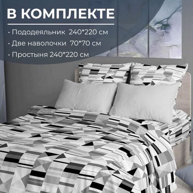 В комплекте: пододеяльник Евромакси размером 240*220 см (вход в пододеяльник выполнен в нижнем шве – прорезь длиной 70 см), простыня размером 240*220 см, две наволочки размером 70*70 см с клапаном не менее 25 см.