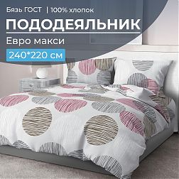 В комплекте: пододеяльник Евромакси размером 240*220 см (вход в пододеяльник выполнен в нижнем шве – прорезь длиной 70 см), простыня размером 240*220 см, две наволочки размером 70*70 см с клапаном не менее 25 см.