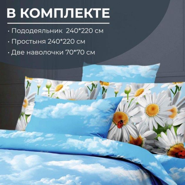 Размеры: пододеяльник Евромакси 240*220 см (вход в пододеяльник в нижнем шве – прорезь длиной 70 см), простыня 240*220 см, две наволочки 70*70 см с клапаном не менее 25 см.