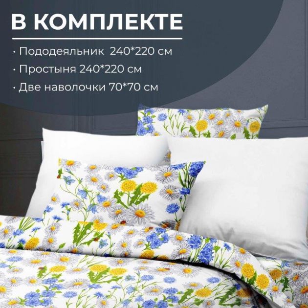 В комплекте: пододеяльник размером 240*220 см (вход для одеяла расположен в боковом шве), простыня размером 240*220 см, две наволочки размером 70*70 см с глубоким клапаном (не менее 25 см). Расположение рисунка на наволочках может незначительно отличаться от фото.