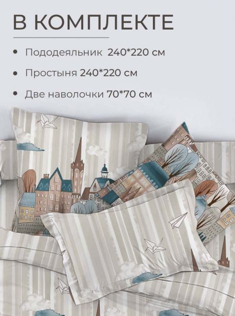 Размеры: пододеяльник 240*220 см (вход в пододеяльник в нижнем шве), простыня 240*220 см, две наволочки 70*70 см с клапаном не менее 25 см. Размерность комплекта