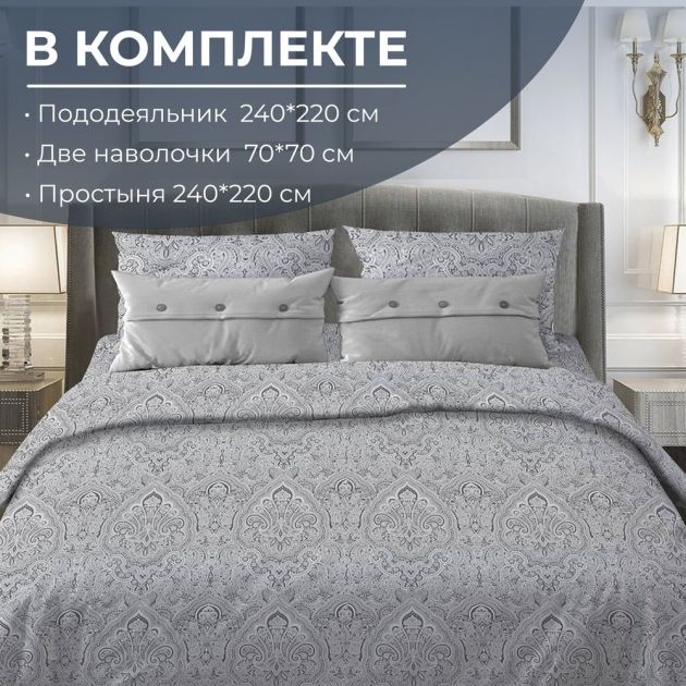 Комплект постельного белья Евромакси, поплин (Дамаск, серый)