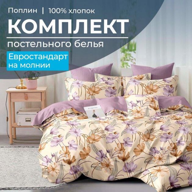 Комплект постельного белья Евростандарт, на молнии, поплин (Цветочный джаз)