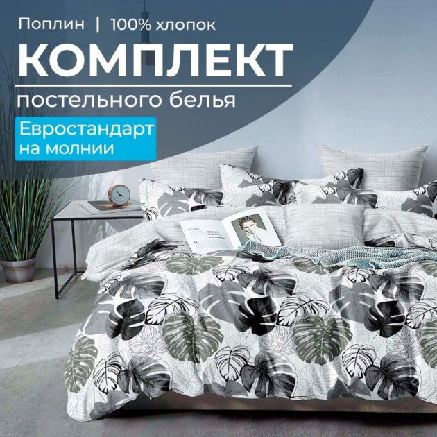 Комплект постельного белья Евростандарт, на молнии, поплин (Листья Диаманте)