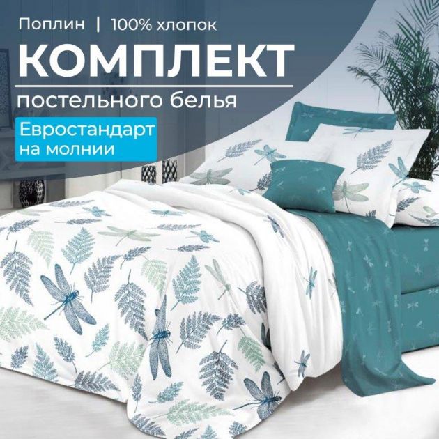 Комплект постельного белья Евростандарт, на молнии, поплин (Стрекоза)
