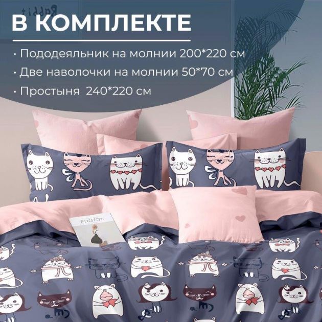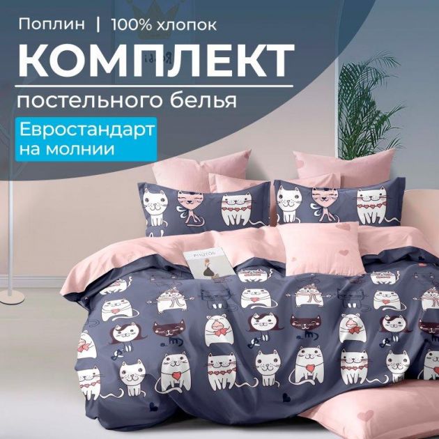 Комплект постельного белья Евростандарт, на молнии, поплин (Забавные котики)