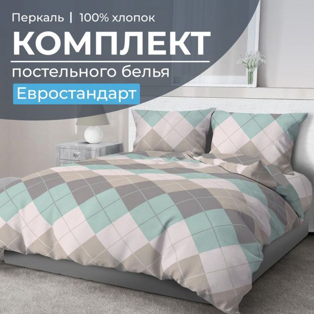 Комплект постельного белья Евростандарт, перкаль (Клетка Паддингтон, мятная)