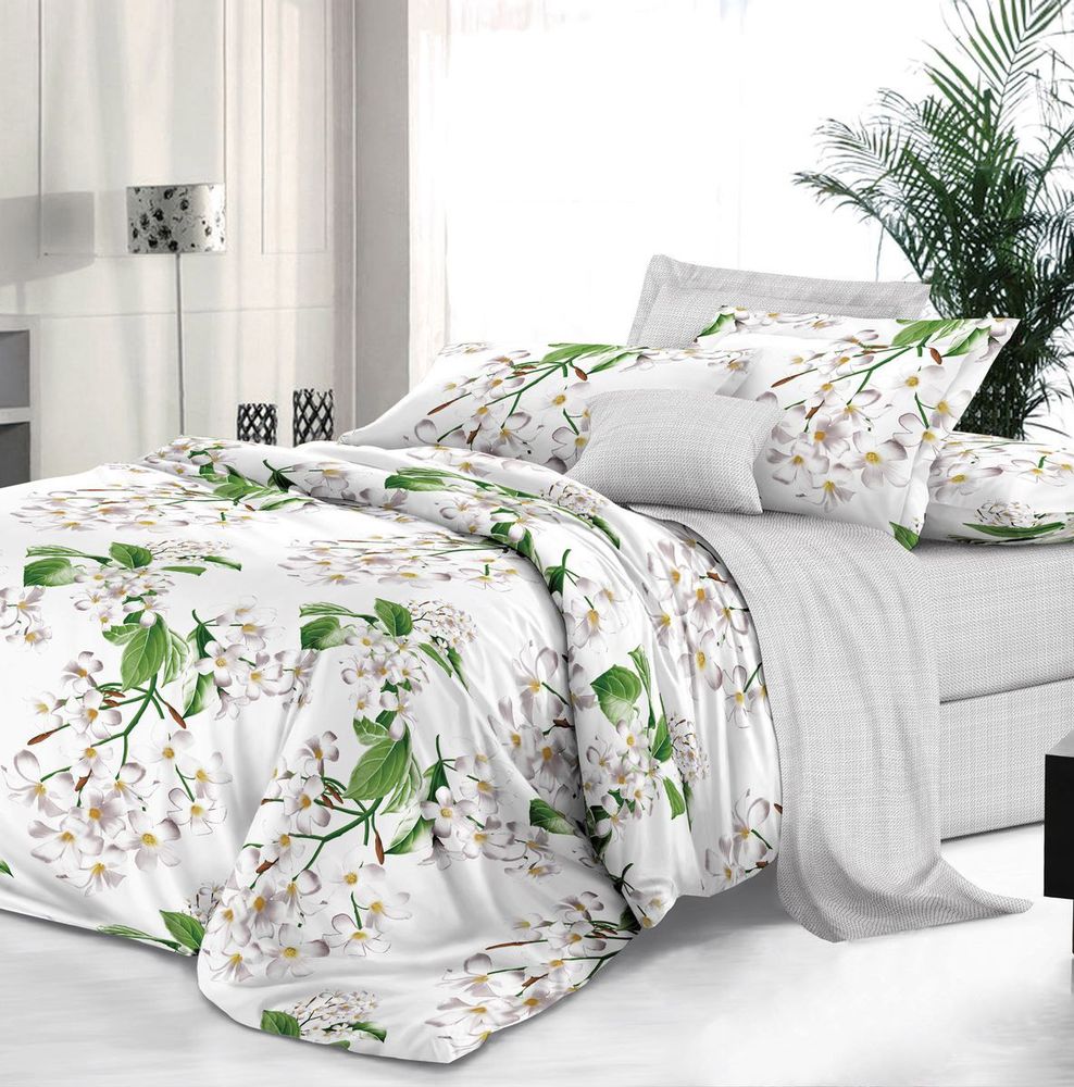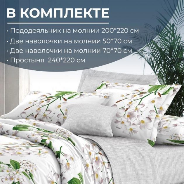 Размеры: пододеяльник 200 * 220 см, простыня 240 * 220 см, наволочка 70 * 70 см - 2 штуки, 50 * 70 см - 2 штуки. Артикул