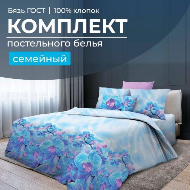 Комплект постельного белья Семейный, бязь ГОСТ (Орхидеи, бирюзовый)