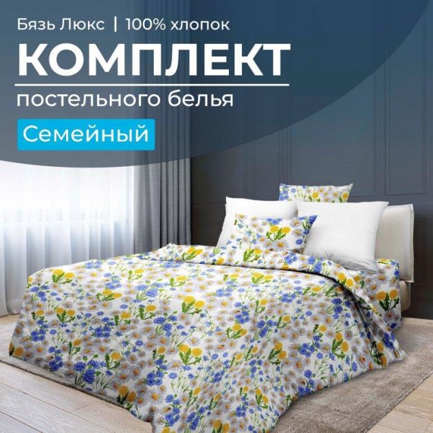 Комплект постельного белья Семейный из бязи «Люкс» плотностью ткани 121 г/м2 пользуется высоким спросом. Это добротное постельное белье для повседневного использования из 100% натурального хлопка. По сравнению с обычной, бязь "Люкс" обладает более нежной и тонкой текстурой, но одновременно с этим прочная и плотная. Постельное белье из бязи «Люкс» не электризуется, мало сминается и легко отстирывается, пропускает воздух, высокоустойчивое к износу и абсолютно безопасно для здоровья. Рисунки на ткани из бязи "Люкс" яркие, выдерживают многочисленное использование.