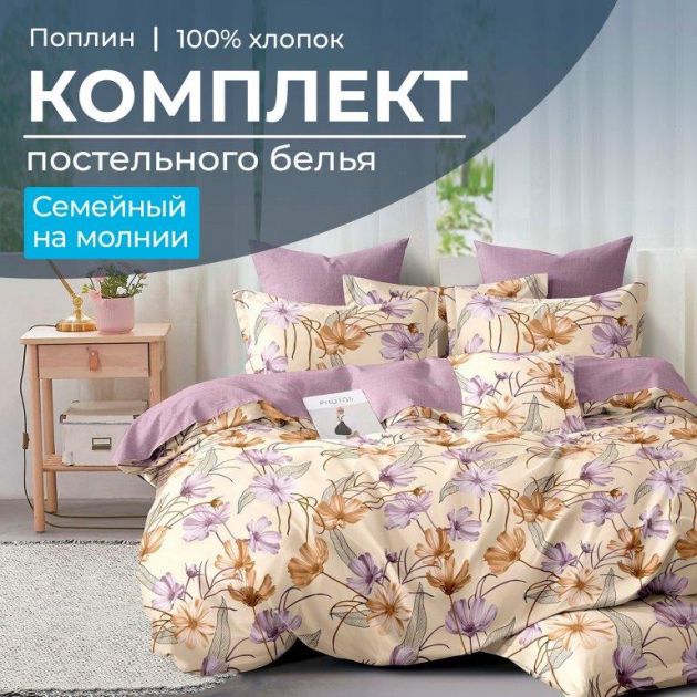 Комплект постельного белья Семейный, на молнии, поплин (Цветочный джаз)