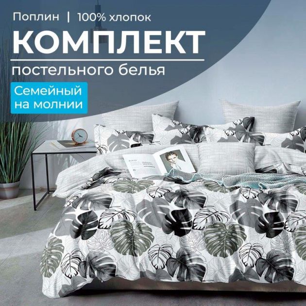 Комплект постельного белья Семейный, на молнии, поплин (Листья Диаманте)