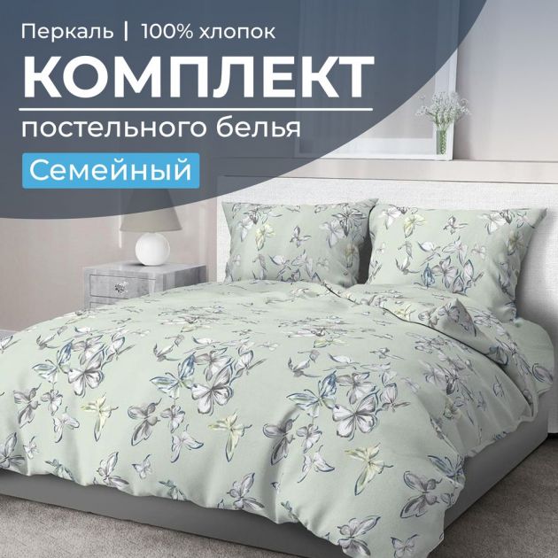 Комплект постельного белья Семейный, перкаль (Астерия, мятный)
