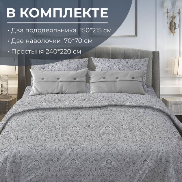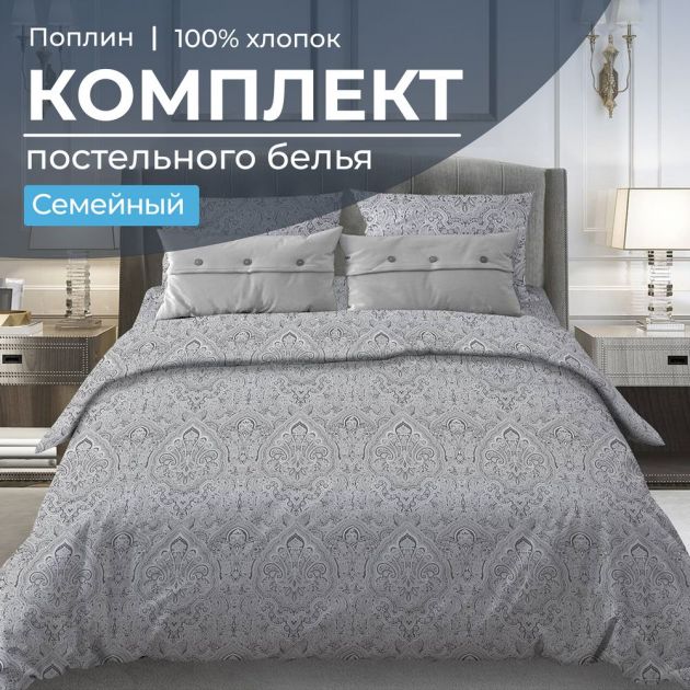 Комплект постельного белья Семейный, поплин (Дамаск, серый)