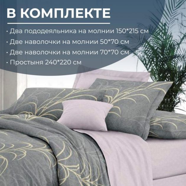 Комплектность: пододеяльник 2 шт., простыня 1 шт., наволочка 4 шт.