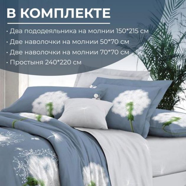 Комплектность: пододеяльник 2 шт., простыня 1 шт., наволочка 4 шт.