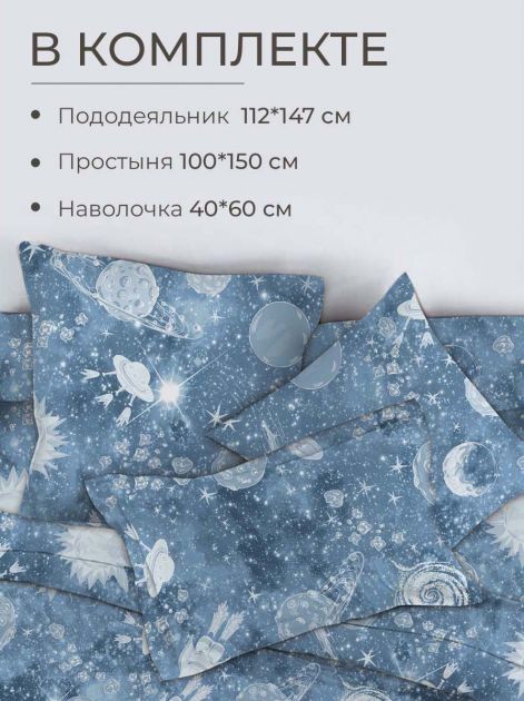 Размеры: пододеяльник 112*147 см, простыня 100*150 см и наволочка 40*60 см на клапане.