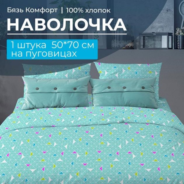 Наволочка 50*70 см, бязь "Комфорт", на пуговицах (Треугольники, бирюзовый)