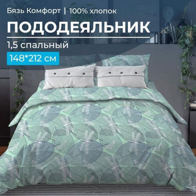 Пододеяльник 1,5-спальный, бязь "Комфорт" (Стрекозы, мятный)
