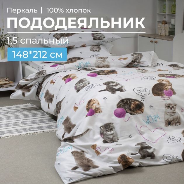Пододеяльник 1,5-спальный, перкаль, детская расцветка (Пушистики)
