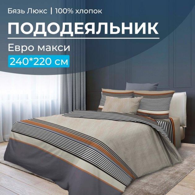 Пододеяльник Евромакси размером 240*220 см из бязи "Люкс", которая не линяет, не пиллингуется, практически не дает усадки. Состав ткани - хлопок 100 %. Прорезь пододеяльника расположена в нижнем шве. Плотность бязи 121 г/м2. Размер пододеяльника
