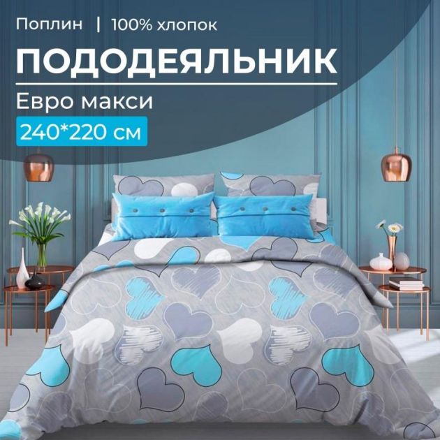 Пододеяльник Евромакси 240*220 см, поплин (Романтика, голубой)